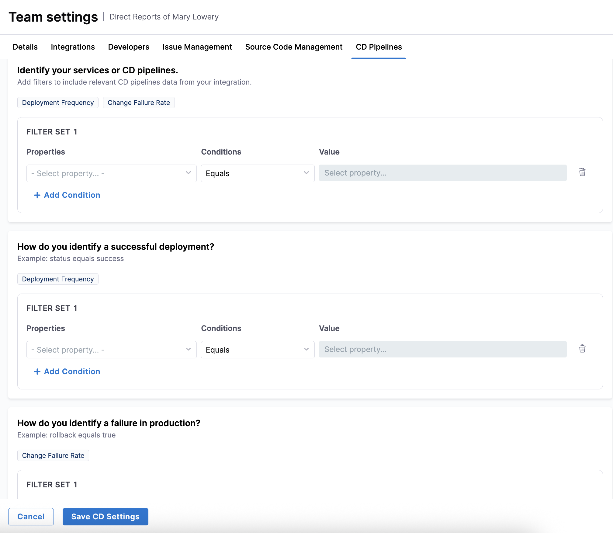 Create filter sets to include relevant pipelines or services, define successful deployments (for example,